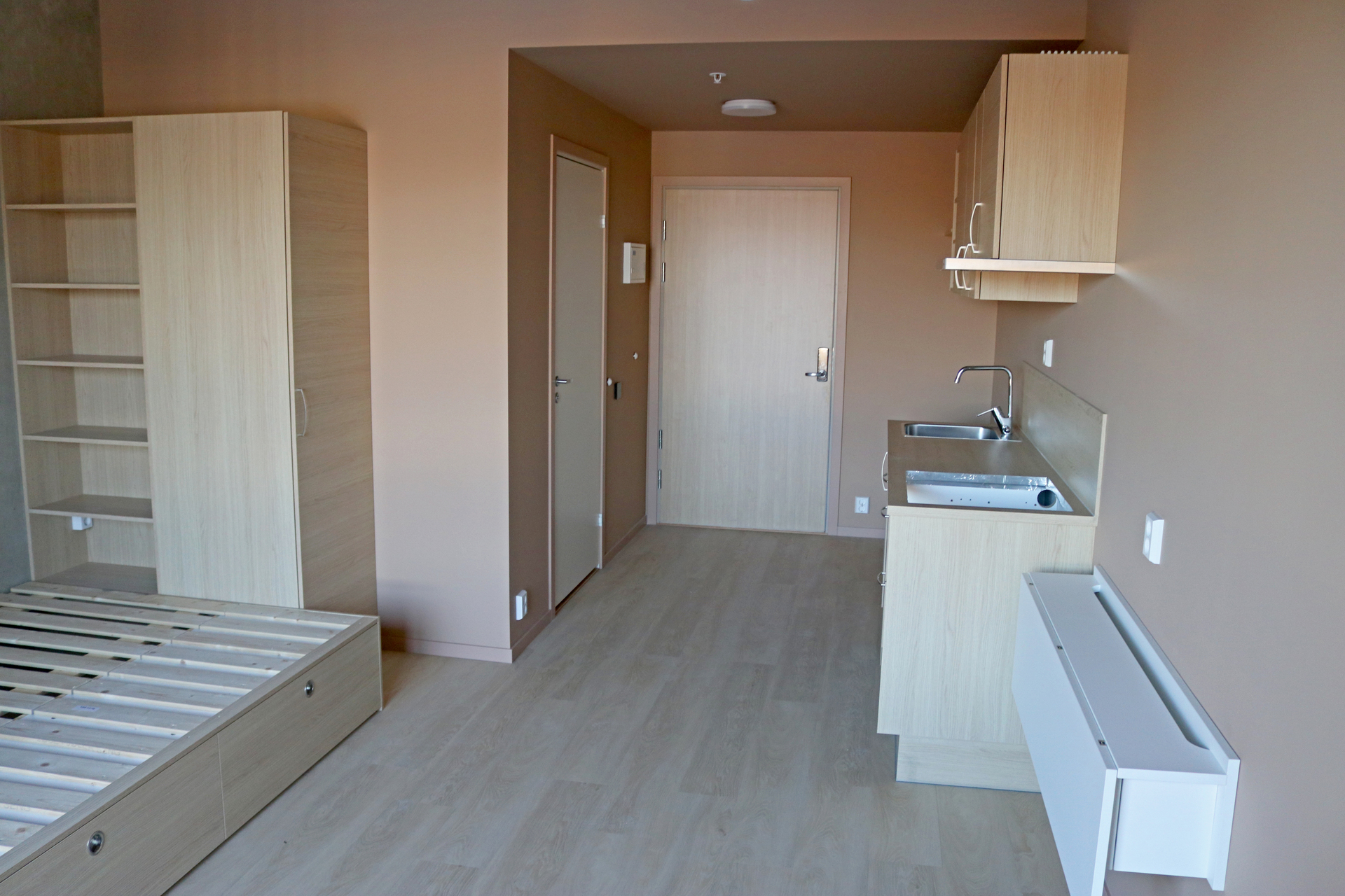 Referansehyblene ble levert med komplett kjøkken, senger og listverk, slik studentene skal møte dem.